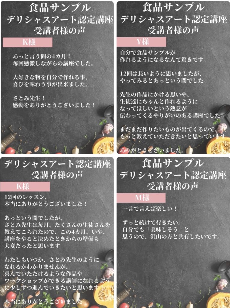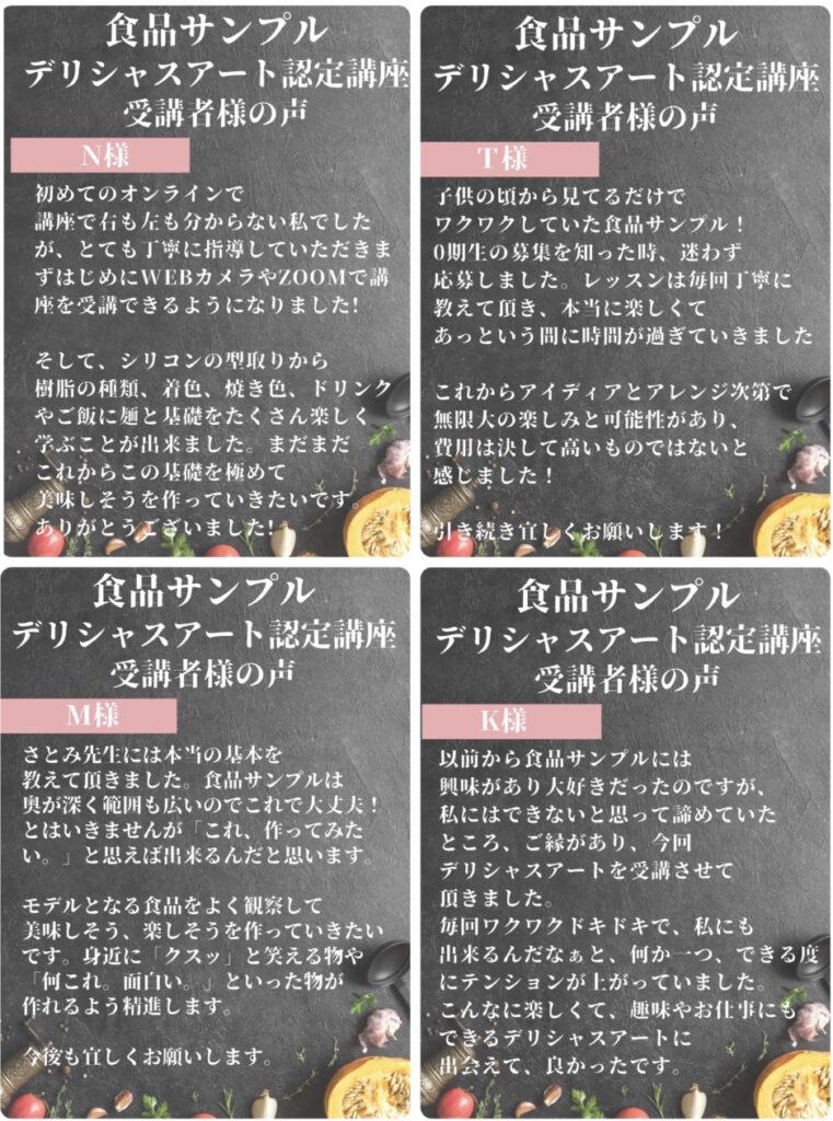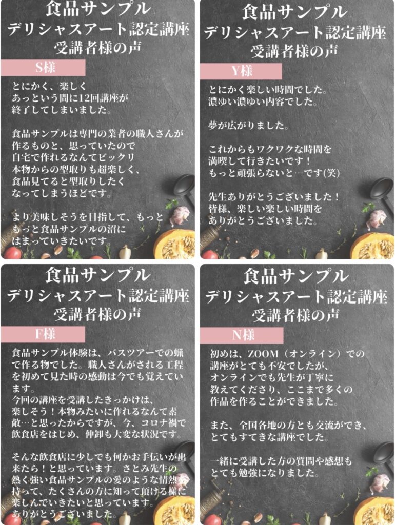講座終了後もサポートもさせて頂きますので、この機会に食品サンプルデリシャスアート®︎講座で